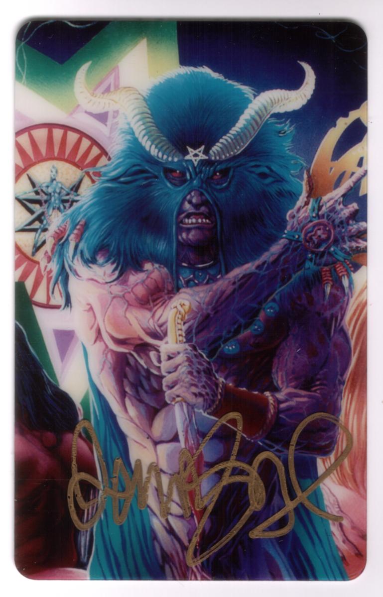 He grips a chain weapon with one hand, which is detailed with blue beads or spheres along its length. The background includes bold graphic elements, such as a red and white circular design visible behind the warrior’s left shoulder and bright green geometric shapes. The card has been signed in bold gold ink across the lower part of the artwork.