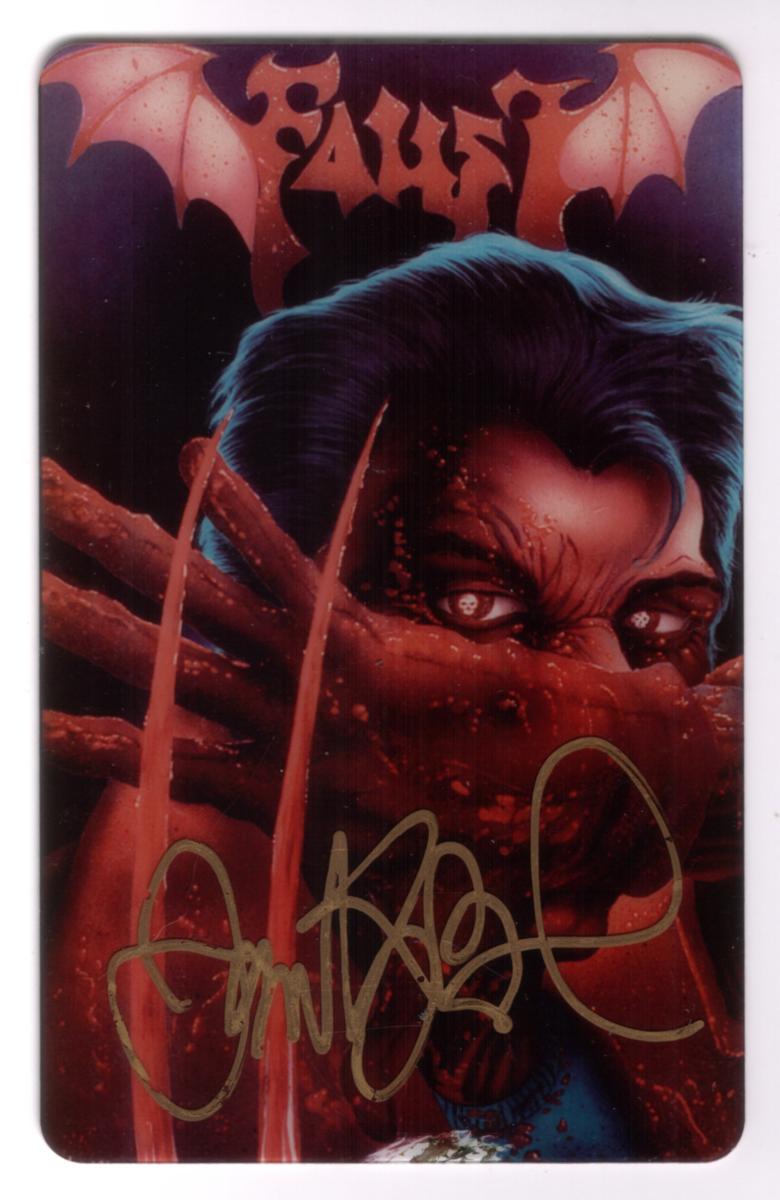 The card is signed in gold ink across the lower portion by the artist or creator, enhancing its collectible value. The signature is bold and clearly visible without overlapping or obscuring critical visual elements of the artwork. The color palette is dominated by reds, dark blues, and blacks, contributing to the ominous atmosphere of the piece.