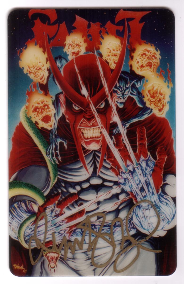 This collectible card is clearly focused on showcasing the artistic collaboration of Tim Vigil and David Quinn. The fiery devil figure and dynamic flames make it visually striking. The presence of a signature adds to the card’s collectible value. The imagery and text together establish "Faust 3" as the subject, with a strong emphasis on fantasy and dark supernatural themes.