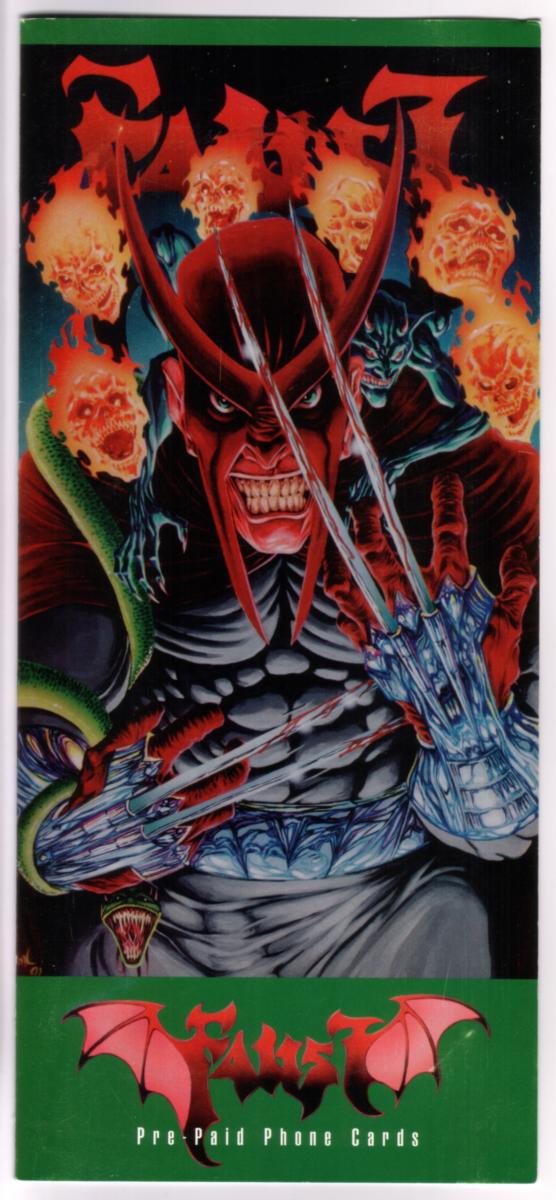 These three collectible phone cards feature artwork from the Faust comic series by Tim Vigil and David Quinn, issued by Public Access under PATCO. Each card showcases dark, intense, and highly detailed illustrations characteristic of the Faust graphic novels.