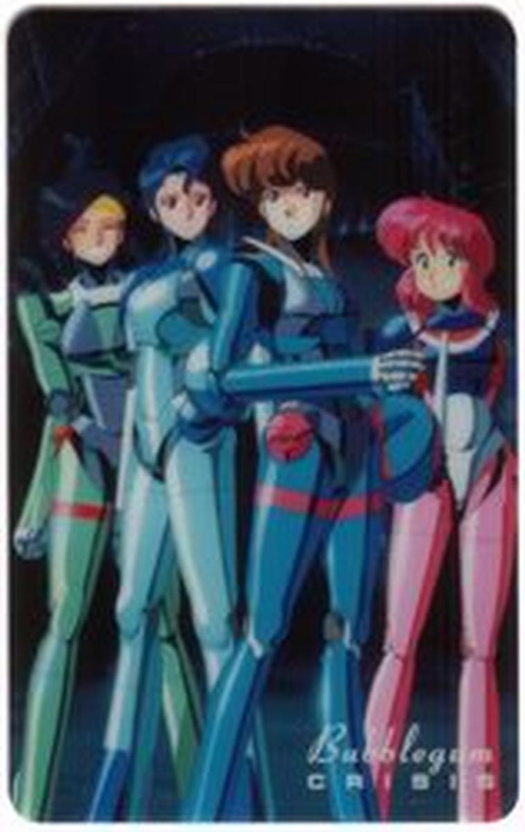 The female characters are dressed in futuristic, armor-like costumes that blend technological and comic book aesthetics, consistent with the Bubblegum Crisis franchise. Their outfits incorporate sleek lines and vibrant color schemes that highlight their roles as heroines, underscoring themes of empowerment and teamwork within the fantasy art genre. The card includes the “PATCO” logo, indicating the issuer or related branding.