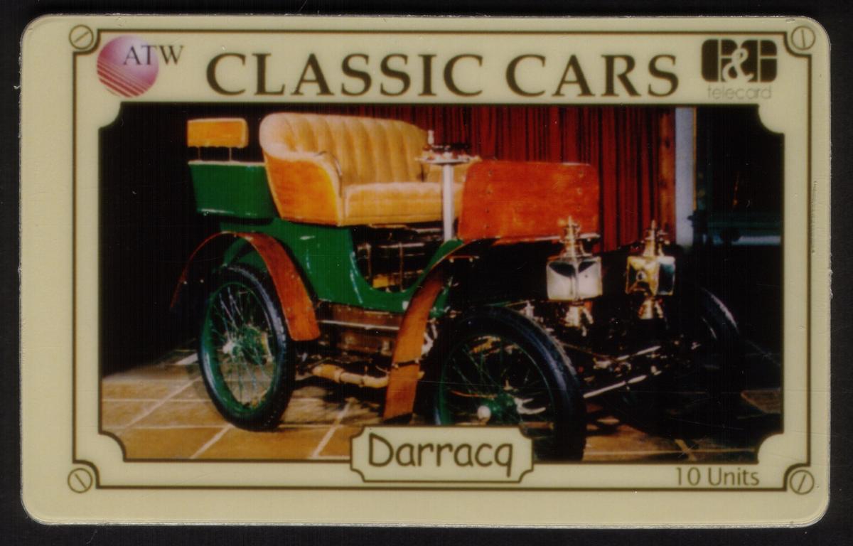 The card includes the names "Darracq" and "Type Bollee Tonneau 1899" printed clearly, along with the series title "10u Classic Cars Series." It is issued by AmeriVox and marked with the notation "ATW," indicating its alignment with AmeriVox’s collectibles under the ATW series. The card also carries the denomination "10u," signifying its unit value within the series.