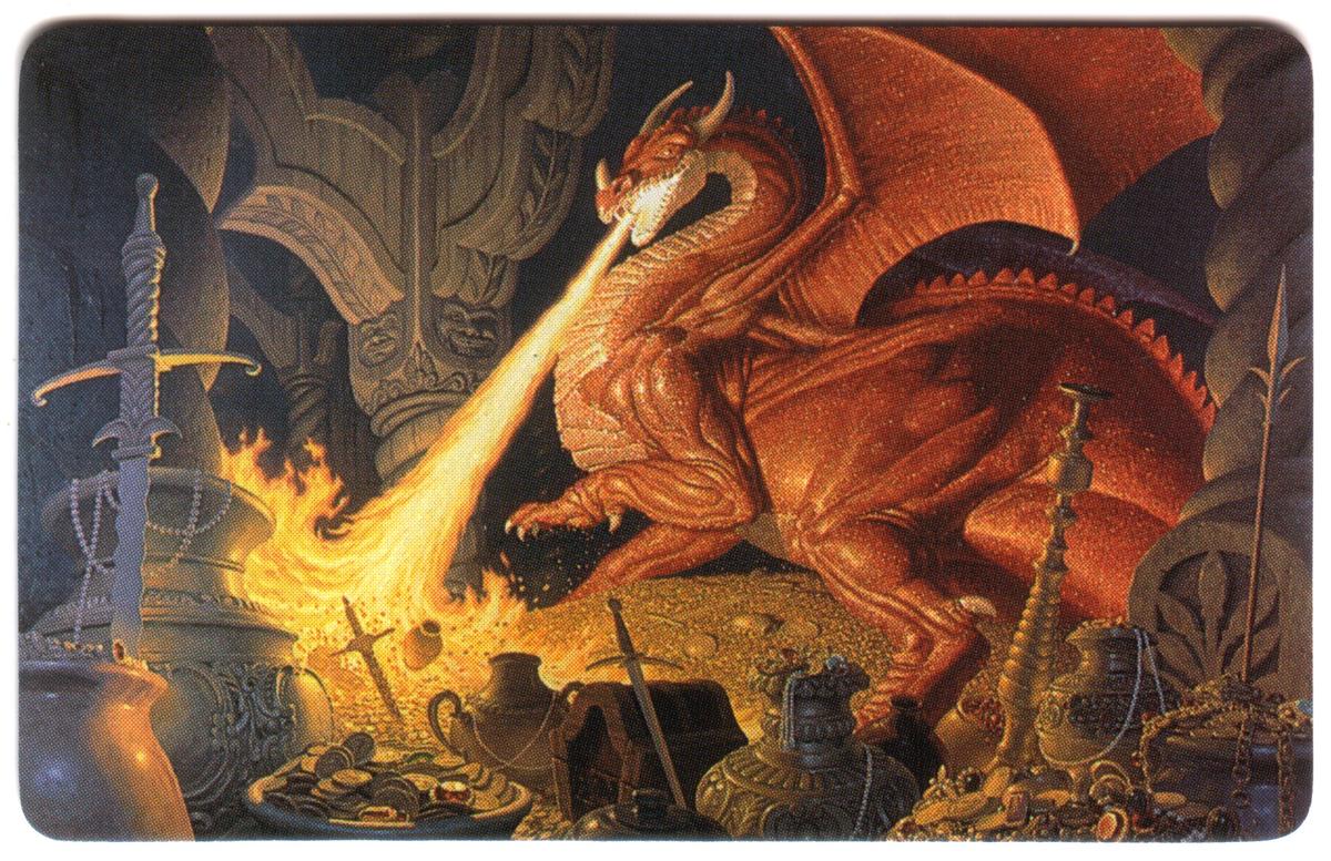 This collectible phone card features artwork from the world of J.R.R. Tolkien, specifically depicting Smaug the Dragon from "The Lord of the Rings" universe. The artwork is by Greg and Tim Hildebrandt, renowned artists known for their fantasy and comic art style. Smaug is shown prominently, with detailed scales and fiery colors that capture the dragon’s menacing presence. The design blends fantasy art elements with comic-style illustration, showcasing a dramatic and vivid portrayal.