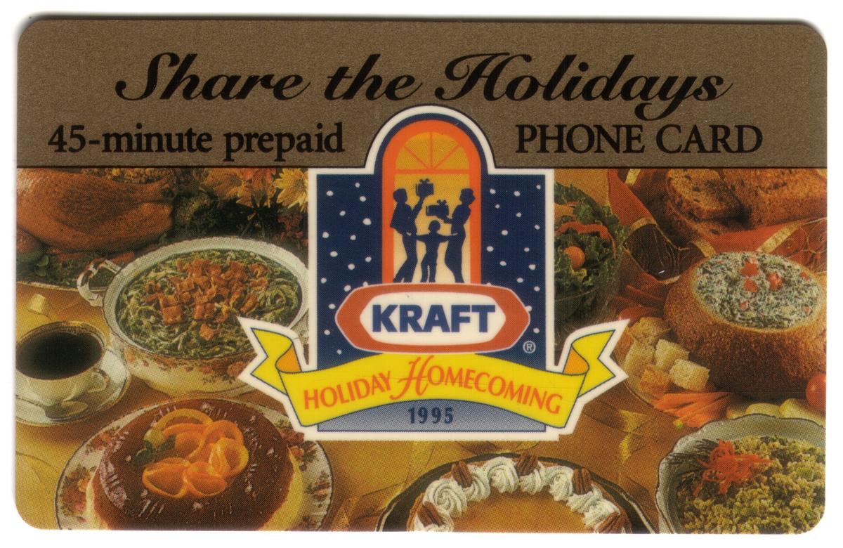 The card ties together the theme of holiday sharing and togetherness through its text and imagery, highlighting Kraft’s promotional focus for the 1995 holiday season. The combination of the Kraft logo and the rich festive meal imagery makes this phone card a distinctive collectible linked to the Kraft Foods 1995 holiday campaign.