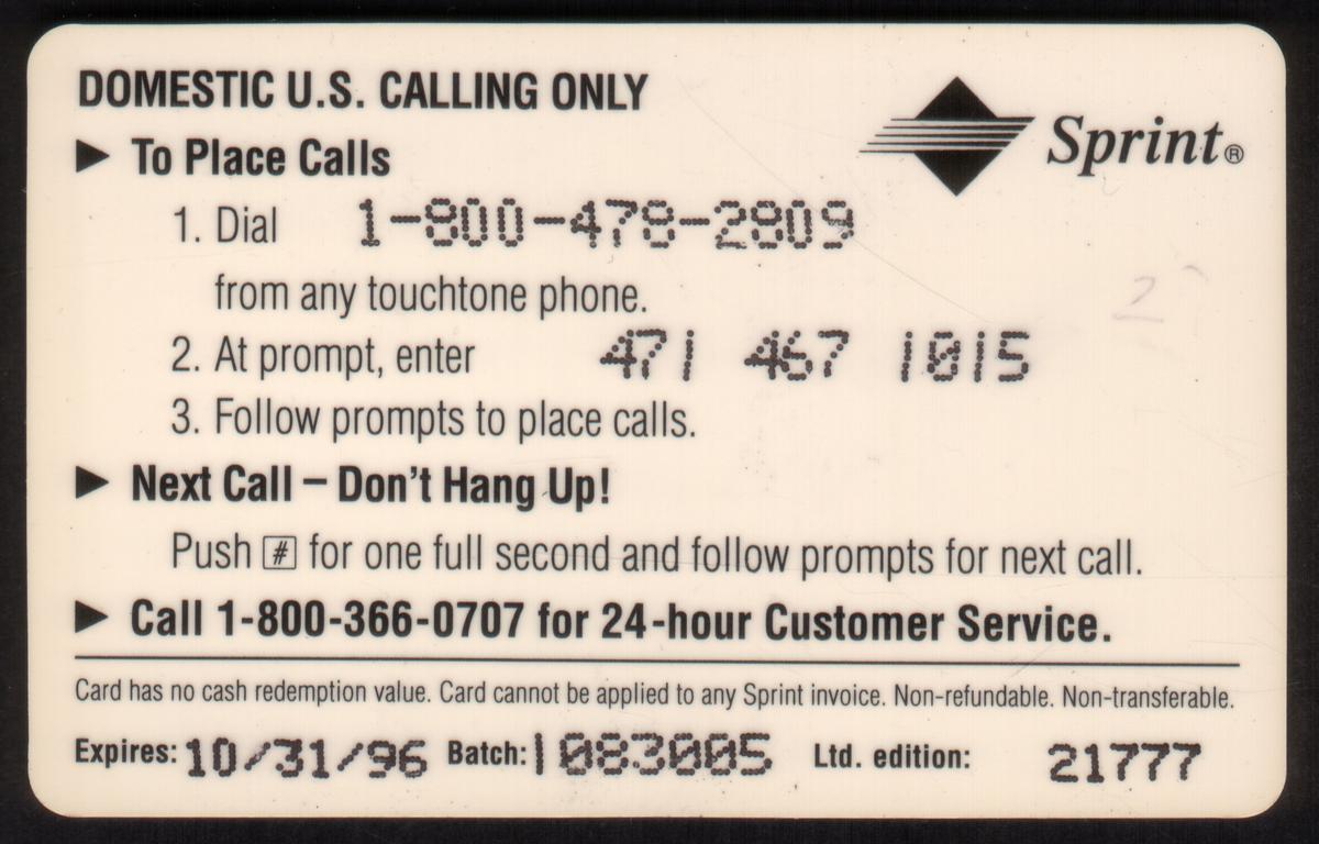 Since we have the world's largest inventory of USA phonecards for collectors, you will not necessarily receive the identical serial/batch/PIN number that we have scanned/pictured.