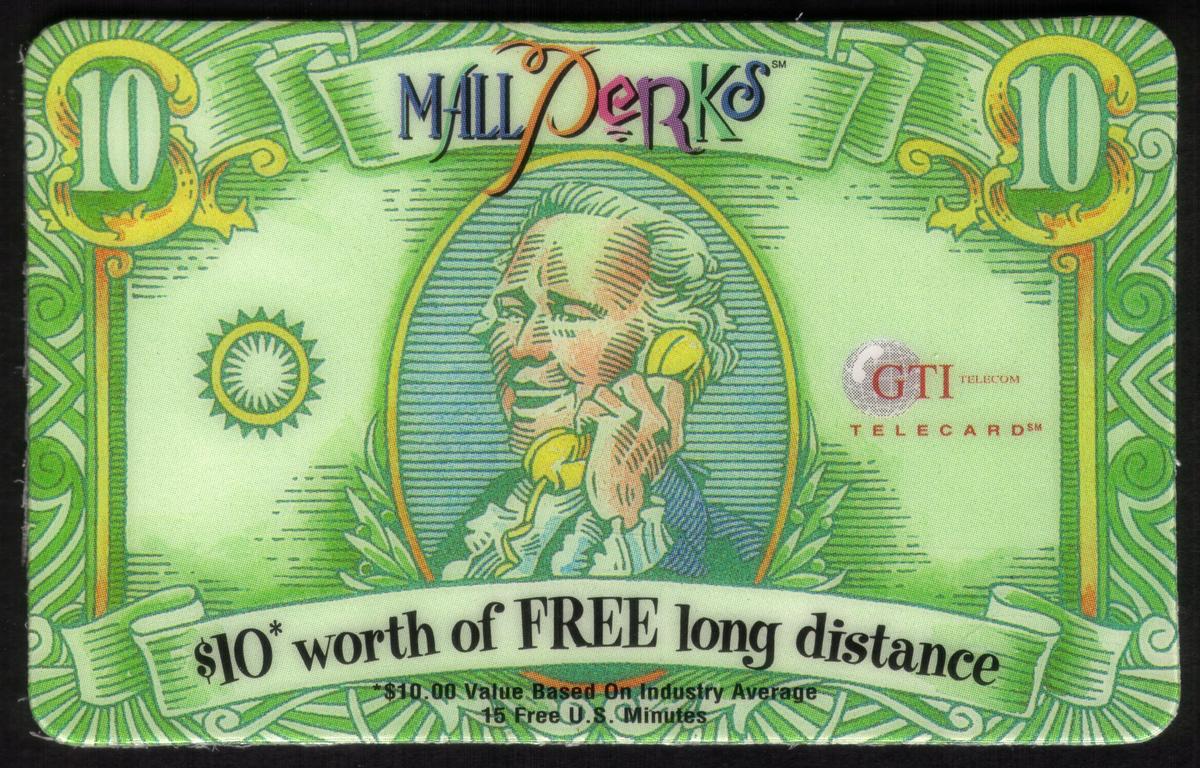 Overall, this phone card represents a telecommunications product marketed at shoppers and consumers participating in the 15m Mall Perks program, with an emphasis on offering prepaid calling services through GTI Telecom, Inc. It is designed for collectors or users who value the association with mall promotions and the phone service value indicated on the card face.