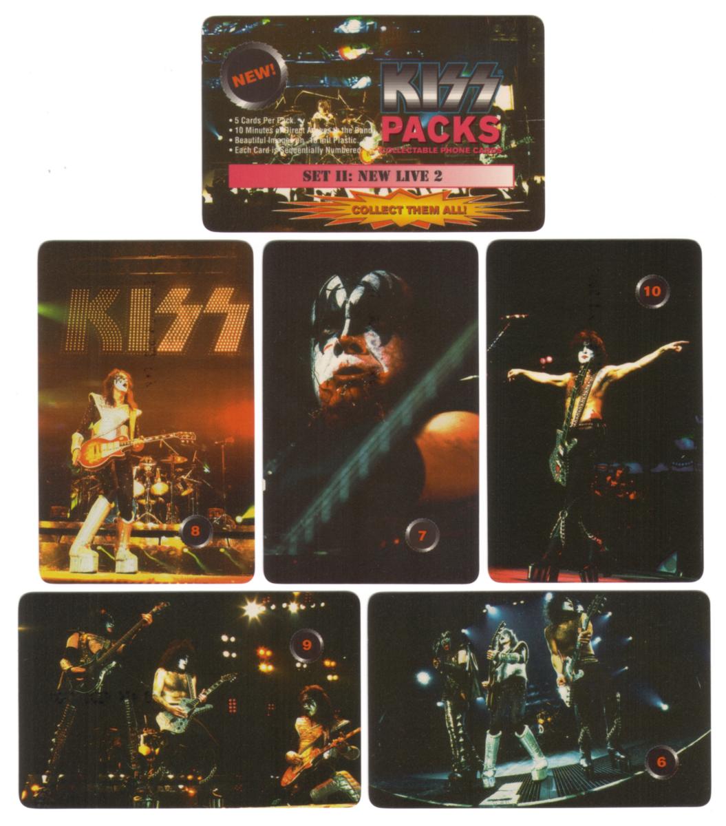 The set is labeled as "KISS Pack Set II New Live," containing multiple cards numbered #6-10. It is published by Creative Communication and is associated with WorldCom. The cards reflect the entertainment and musical themes tied to the legendary American rock group KISS, known worldwide for their elaborate live shows. One of the cards is noted as a bonus, enhancing the collection’s appeal for music and rock memorabilia enthusiasts.