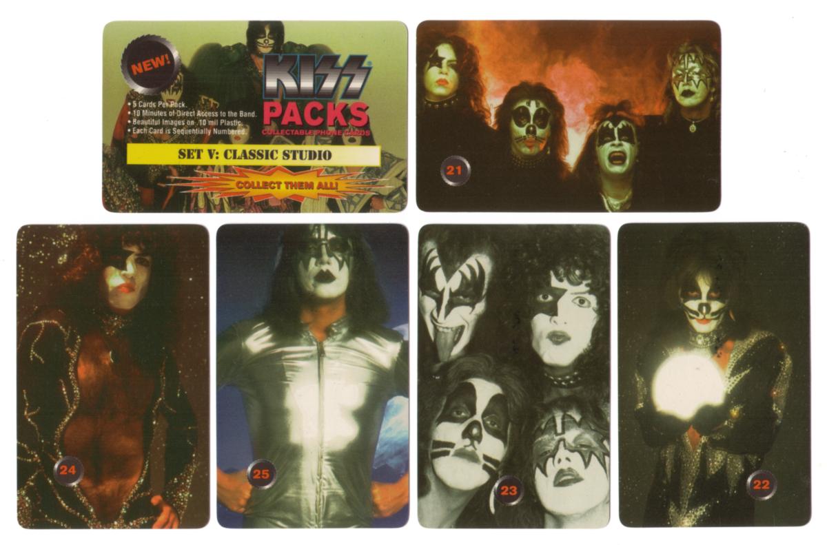 The set includes cards numbered 20 through 25 from the Classic Studio Cards series, produced by Creative Communication. These cards form part of a KISS Pack Set V, emphasizing the band’s role as major musical artists and entertainers. The visuals highlight the individual members’ personalities and rock ‘n roll legacy, making this collection appealing to fans and collectors of music memorabilia.