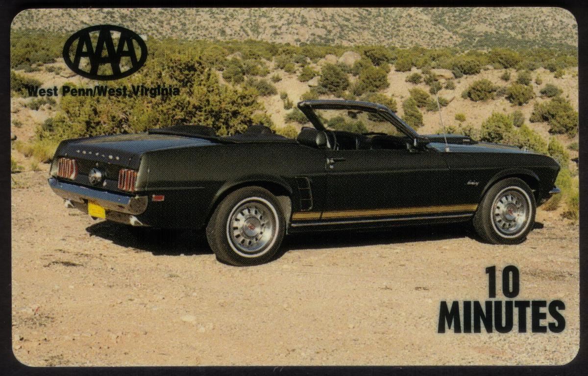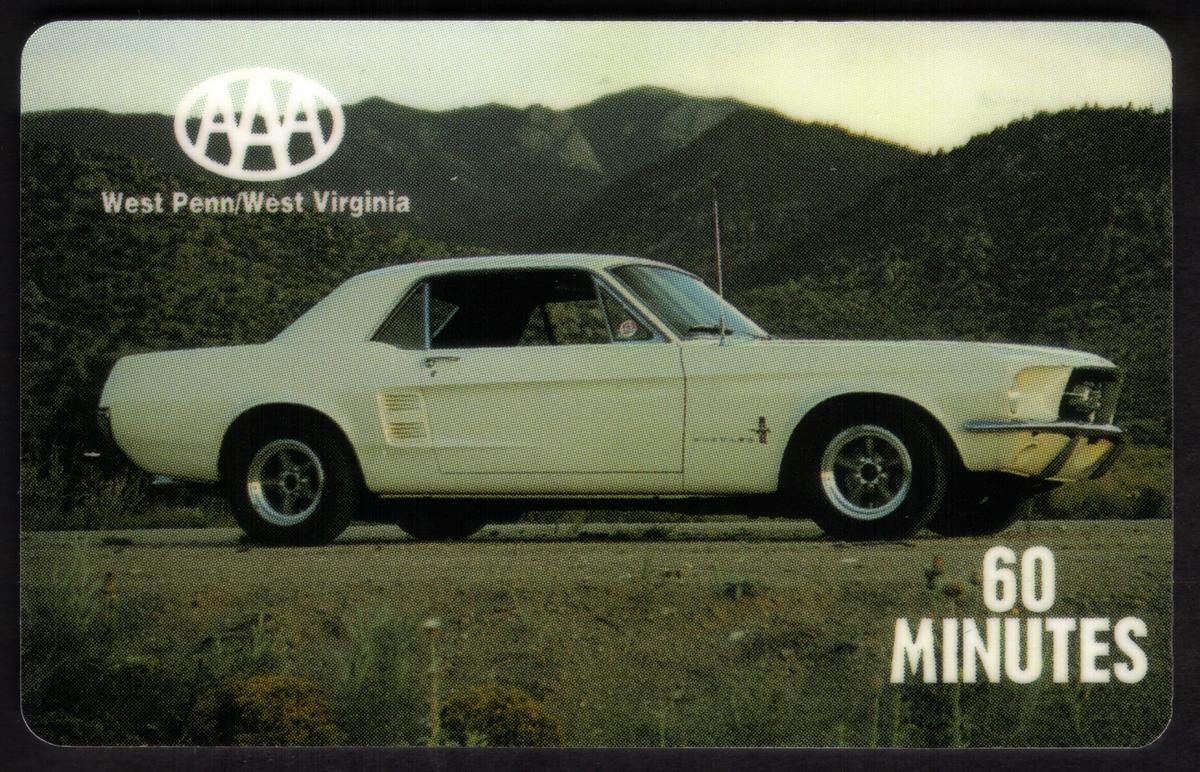 This complete set of six collectible phone cards by AAA West Penn/West Virginia features iconic 1960s Ford Mustang automobiles as its subject. Each card prominently displays the AAA West Penn/West Virginia logo on the front. The vehicles are photographed in outdoor settings with natural backgrounds, highlighting the classic designs and details of each Mustang model.
