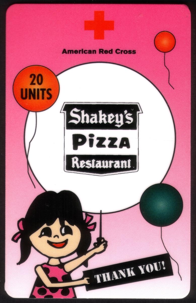 This collectible phone card features a design related to the American Red Cross and Shakey's Pizza Restaurant. The card prominently displays the logos for both organizations, indicating a joint effort or sponsorship. Text on the card includes “American Red Cross” and “Shakey’s Pizza Restaurant,” along with the indication “SPECIMEN PROTOTYPE” in red font, marking this card as a specimen version likely intended for promotional or sample use.
