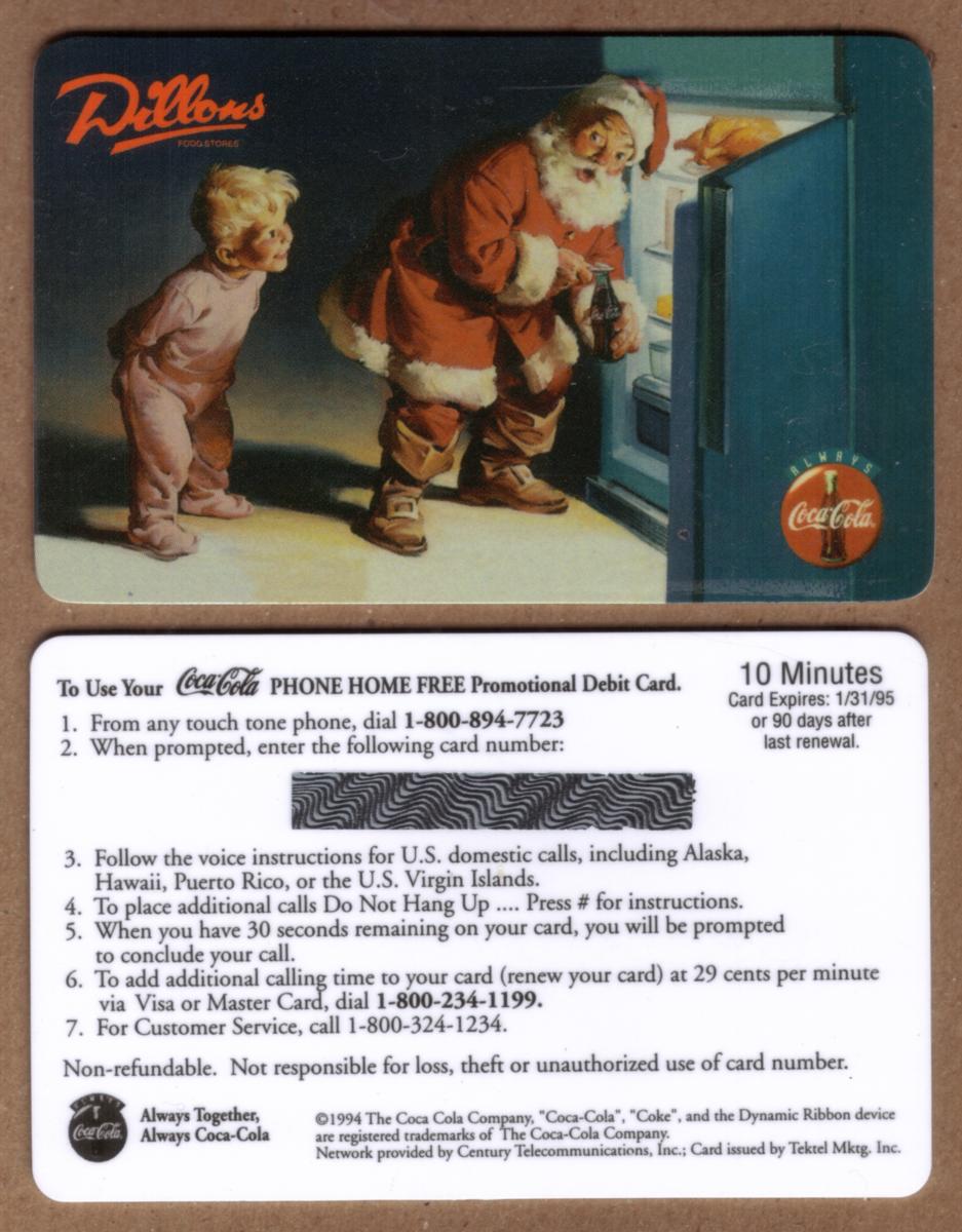 This card, identified by keywords including Dillon’s, TekTel Marketing Inc., and Coca-Cola logos, reflects a festive Christmas advertisement motif. The detailed illustration aligns with Coca-Cola’s long-standing holiday campaign featuring St. Nick and the joyful anticipation of Christmas, centered around the enjoyment of Coca-Cola beverages.