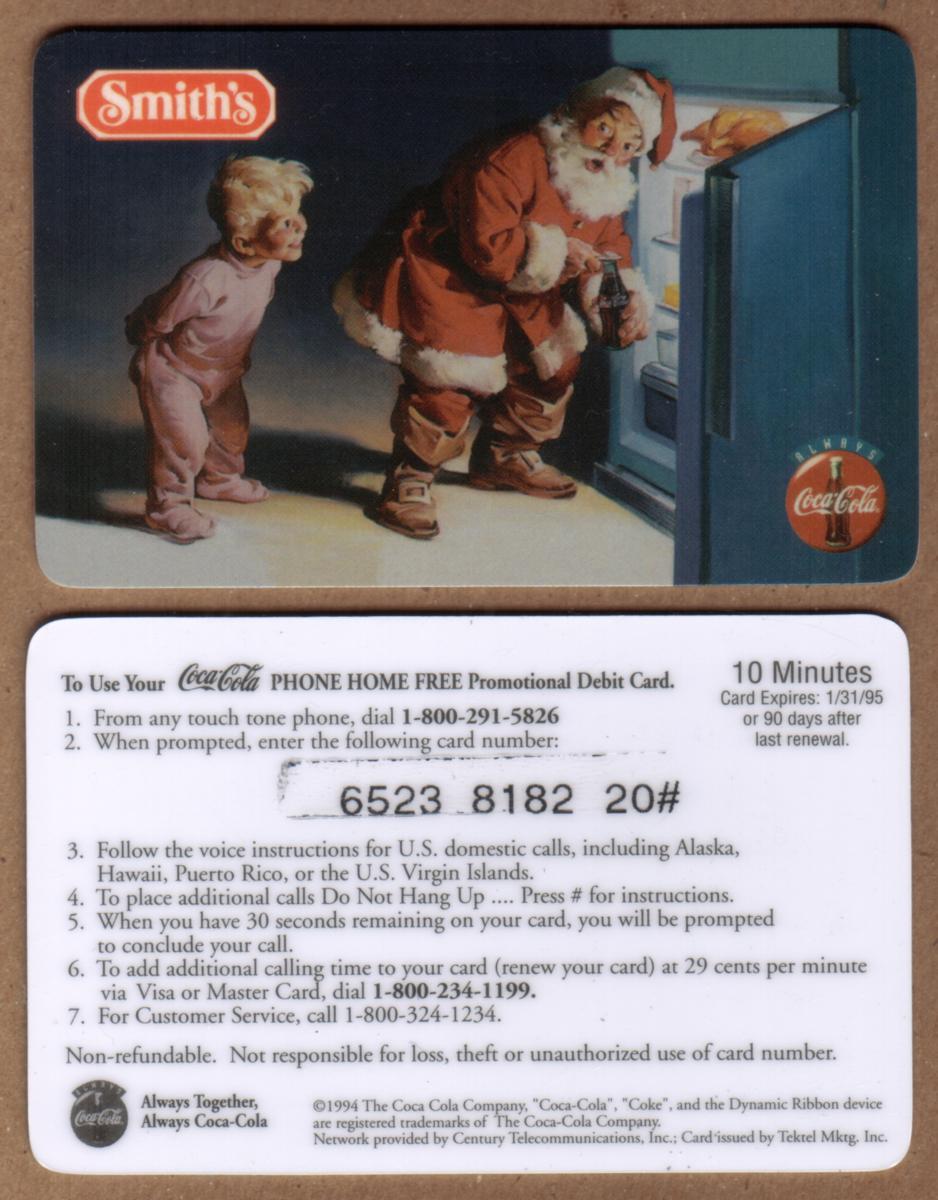 This phone card was produced by TekTel Marketing Inc., as indicated by the accompanying keywords. The imagery and logos together highlight the strong connection between Coca-Cola and Christmas marketing campaigns, featuring recognizable elements like Santa Claus and Coke bottles.