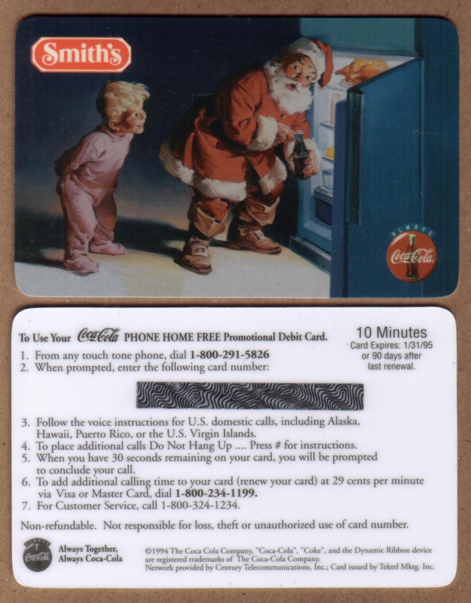 The card is produced by TekTel Marketing Inc., as indicated by the keywords. It celebrates Christmas and Coca-Cola’s iconic imagery by portraying Santa Claus enjoying a Coke, an advertisement style that has been popular for decades. The detailed illustration highlights the joyful connection between holiday spirit and the Coca-Cola brand.