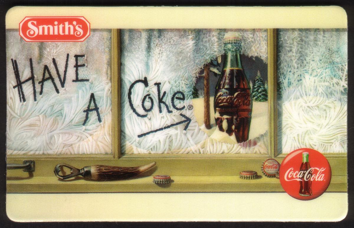 Vintage 1995 Smith’s Coca-Cola phone card featuring icy frost window, classic bottle, bottle caps, and promotional branding, blending nostalgia and advertising. |