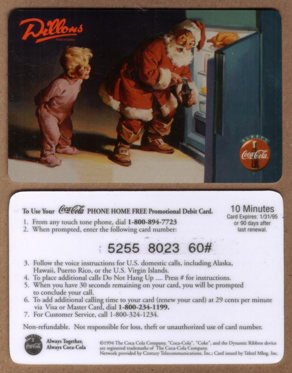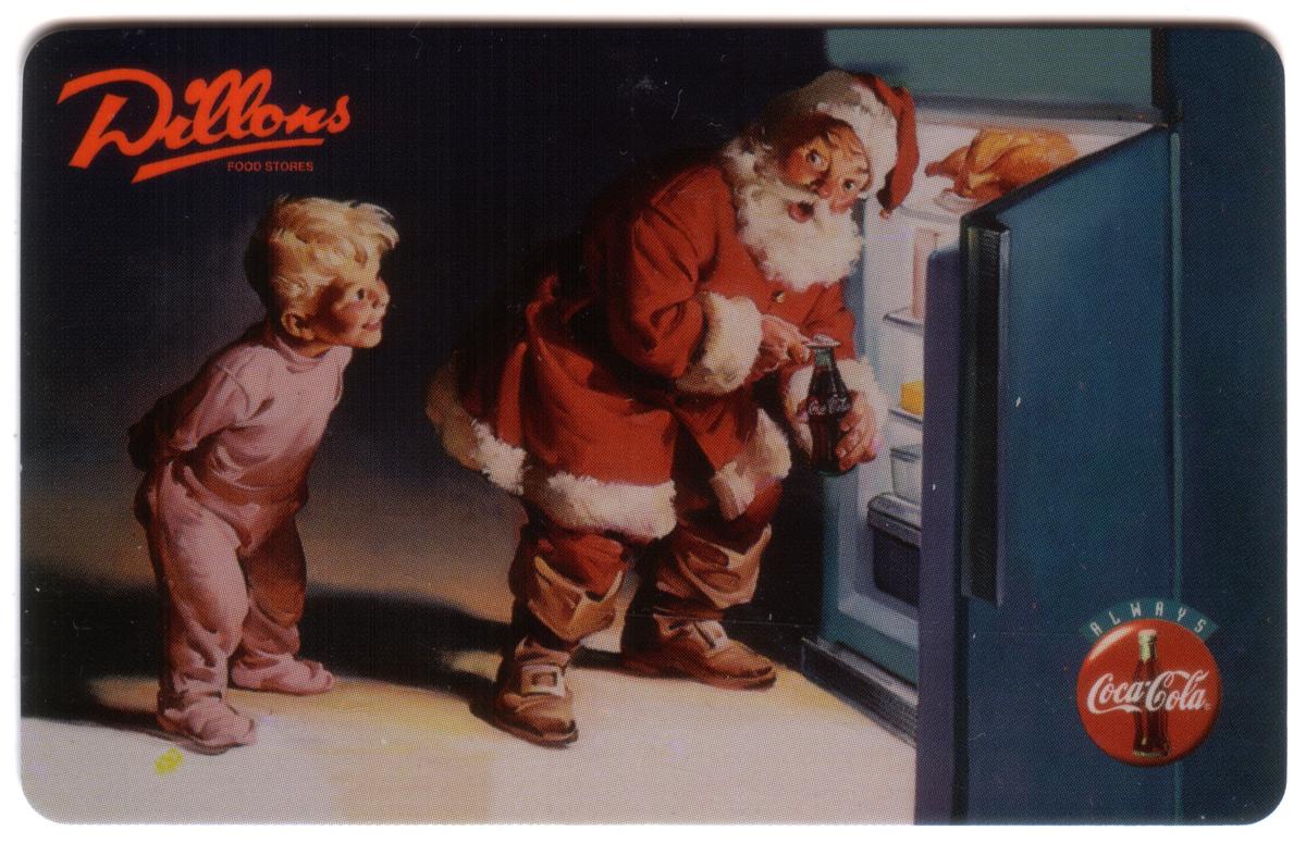 This card is a collectible item produced by TekTel Marketing Inc. and reflects advertising elements including Coca-Cola logos, Coke bottles, and the character of Santa Claus. The setting references Dillon’s 10 million campaign featuring a boy watching Santa retrieve Coca-Cola from the refrigerator.