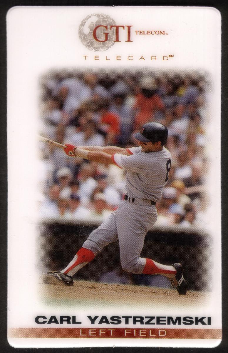This collectible phone card features a photographic image of Carl Yastrzemski, a legendary Major League Baseball player. Yastrzemski is depicted batting, highlighting his role as a left fielder for the Boston Red Sox. The image captures Yastrzemski in uniform, mid-swing, emphasizing his presence as a baseball icon. The card prominently associates with Major League Baseball and the sport of baseball, connecting to the rich history of the Boston, Massachusetts team.