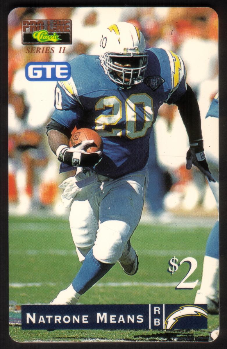The overall presentation highlights the football theme focused on an NFL player, with official branding from “The Score Board (GTE).” The card’s denomination of $2 and “Proline 2” title point to its collectible nature within a limited series focusing on football players, specifically Natrone Means in this instance.