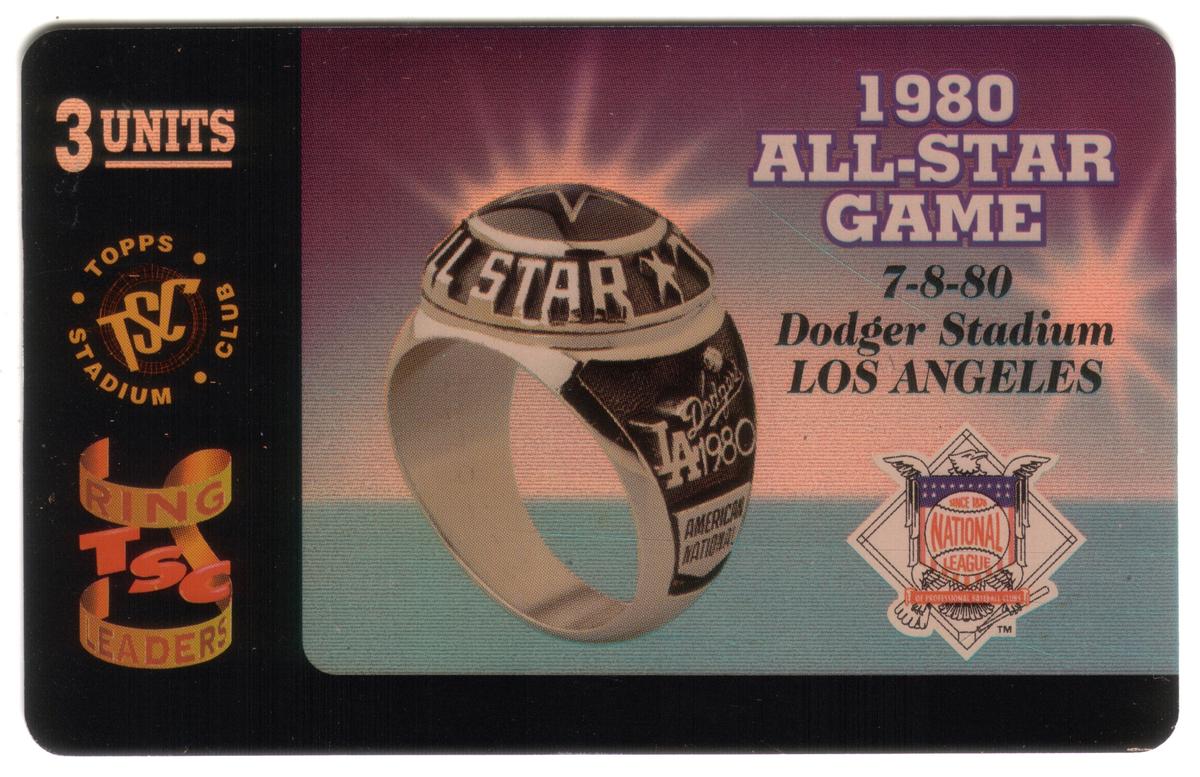 The card is sized to hold 3 units and is part of the Topps Stadium Club Ring Leaders series, affiliated with Major League Baseball players and the National League. The combination of the championship ring image, the All-Star Game details, and the official logos make this collectible a detailed tribute to the 1980 MLB All-Star Game at Dodger Stadium.