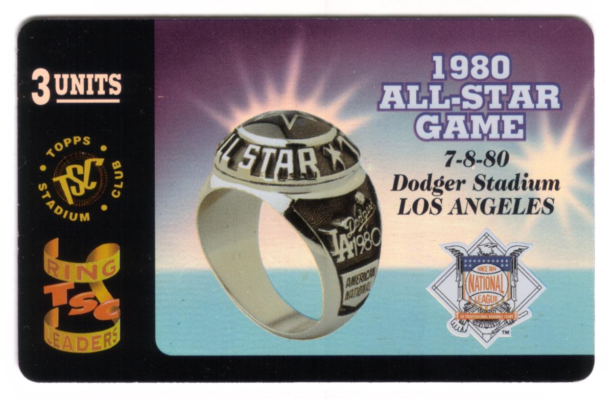 The card highlights the event details of the 1980 All-Star Game which took place on July 8, 1980, at Dodger Stadium in Los Angeles, California. The National League of Professional Baseball Clubs logo appears in the lower right corner, linking the card to Major League Baseball. The left side of the card shows the Topps Stadium Club emblem along with the words "RING LEADERS" and indicates three units are stored on the card.