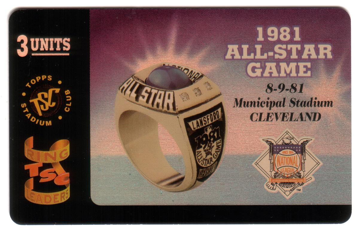 This card is part of the TSC Ring Leaders Ring Leaders series, a branch of the larger Topps product focusing on baseball stars. It prominently commemorates the 1981 All-Star match-up at the Cleveland stadium, connecting both the location and the athletes who represented the National League in this historic exhibition game.