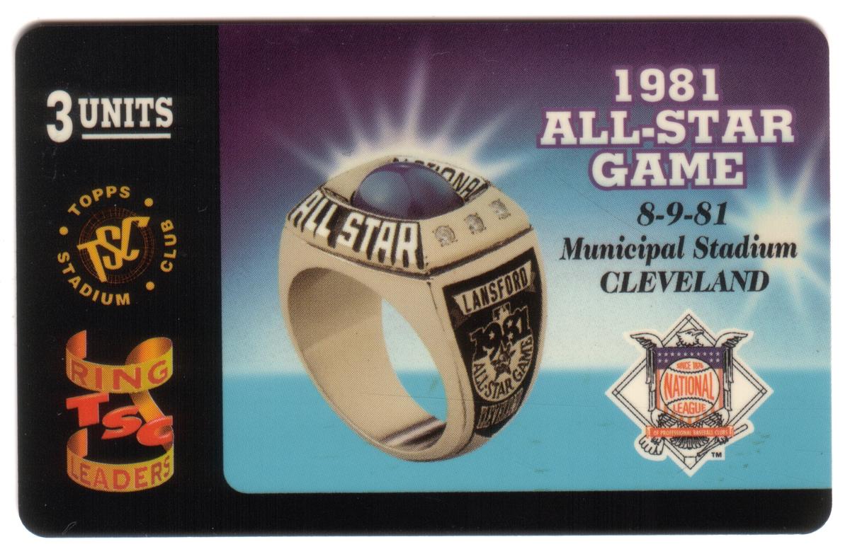 This collectible card features imagery and text related to the 1981 Major League Baseball All-Star Game held at Municipal Stadium in Cleveland, Ohio. It is part of the Topps Stadium Club Ring Leaders series and carries the theme of National League of Professional Baseball Clubs all-star players. The card prominently displays the name "TSC Ring Leaders" and includes the "1981 All-Star Game Cleveland" title. The design incorporates official logos and branding for the 1981 All-Star Game.