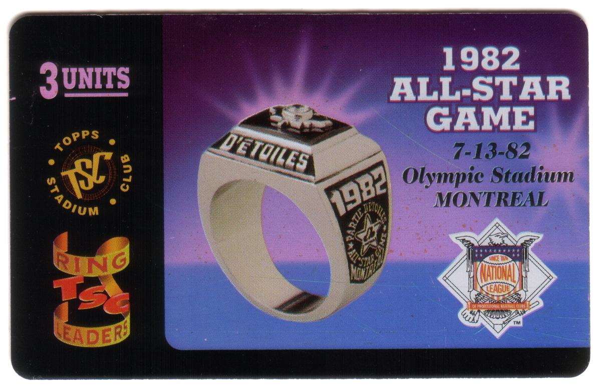 This collectible card features a detailed image related to baseball, specifically the 1982 Major League Baseball All-Star Game held at Olympic Stadium in Montreal, Canada. The card is part of the Topps Stadium Club series titled "1982 All-Star Game Montreal - Silver Ring" and highlights the National League of Professional Baseball Clubs. The card prominently includes the phrase "Ring Leaders," indicating it belongs to the Ring Leaders series that celebrates major league baseball players.