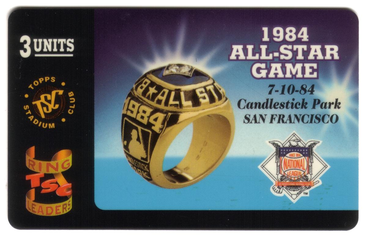 Overall, this collectible card is a licensed sports memorabilia item commemorating the 1984 MLB All-Star Game at Candlestick Park, associated with the Topps Stadium Club brand. It visually connects to the National League’s standout baseball athletes through its distinct graphics, official logos, and clear textual references to the game, venue, and sponsors.