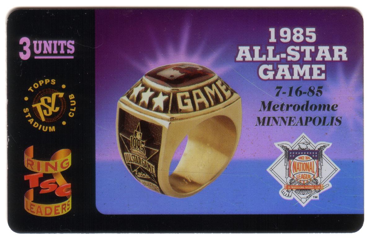 This collectible card commemorates the 1985 Major League Baseball All-Star Game held at the Metrodome in Minneapolis, Minnesota. It is part of the Topps Stadium Club Ring Leaders series, specifically highlighting players from the National League of Professional Baseball Clubs. The card’s design prominently features the term "3u Topps Stadium Club: 1985 All-Star Game Minneapolis - Silver Ring - MCI Communications," connecting it directly to the All-Star event of that year and its sponsorship.