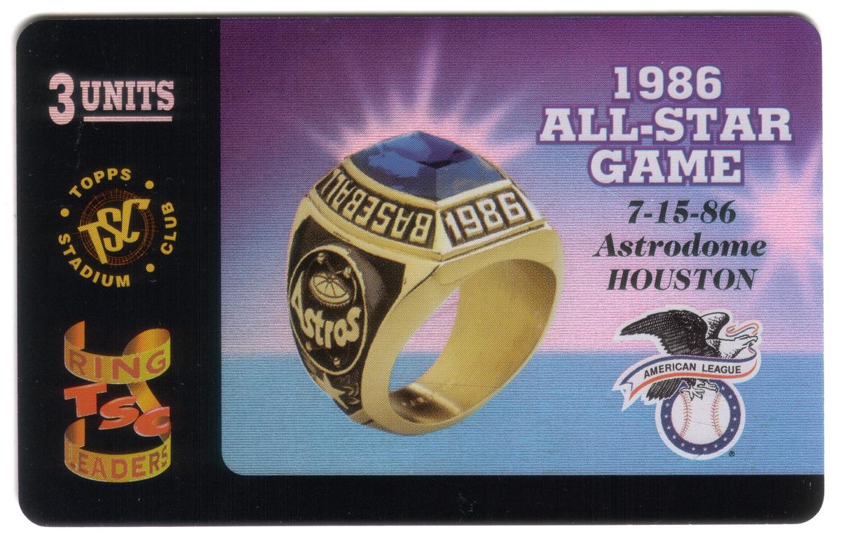 This collectible phone card is part of the Topps Stadium Club Ring Leaders series and commemorates the 1986 Major League Baseball All-Star Game held at the Astrodome in Houston, Texas. The card prominently features the words "1986 All-Star Game Houston," along with "Topps Stadium Club" and "Silver Ring" indicating its special edition status. The American League of Professional Baseball Clubs is referenced, linking it to the league’s official players and event. The card also mentions MCI Communications and WorldCom, identifying the telecommunications sponsor.