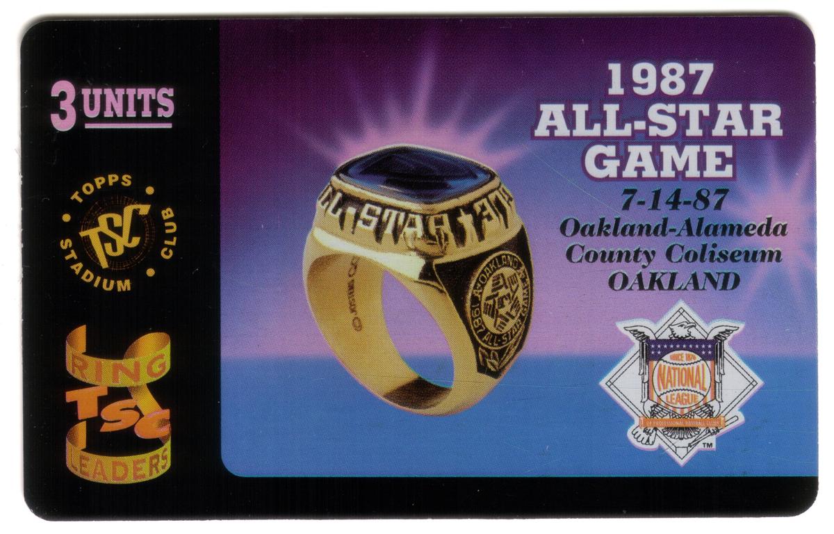 This collectible card features a 1987 Topps Stadium Club design commemorating the Major League Baseball All-Star Game held at the Oakland-Alameda County Coliseum in Oakland, California. The card belongs to the Silver Ring - MCI Communications set within the TSC Ring Leaders series. It displays imagery associated with the National League of Professional Baseball Clubs and Major League Baseball players participating in the All-Star Game.