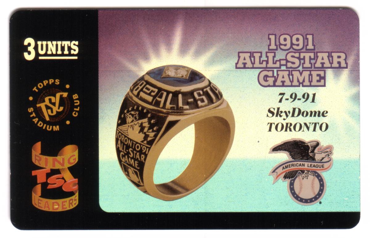 This card combines notable sports memorabilia elements including Major League Baseball, the American League, the SkyDome stadium, and Topps Stadium Club's 1991 All-Star Game ring, celebrating the iconic baseball event held in Toronto.