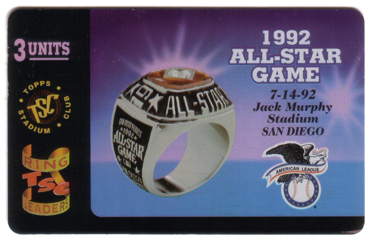 This collectible card features a detailed image related to the 1992 Major League Baseball All-Star Game held at Jack Murphy Stadium in San Diego, California. It is part of the Topps Stadium Club Ring Leaders Series and represents the American League team from the American League of Professional Baseball Clubs. The silver ring design and the inclusion of the MCI Communications logo are prominent. The card highlights the theme of baseball and commemorates the All-Star event with a sleek, metallic silver border design, emphasizing its special edition status within the Topps Stadium Club lineup.