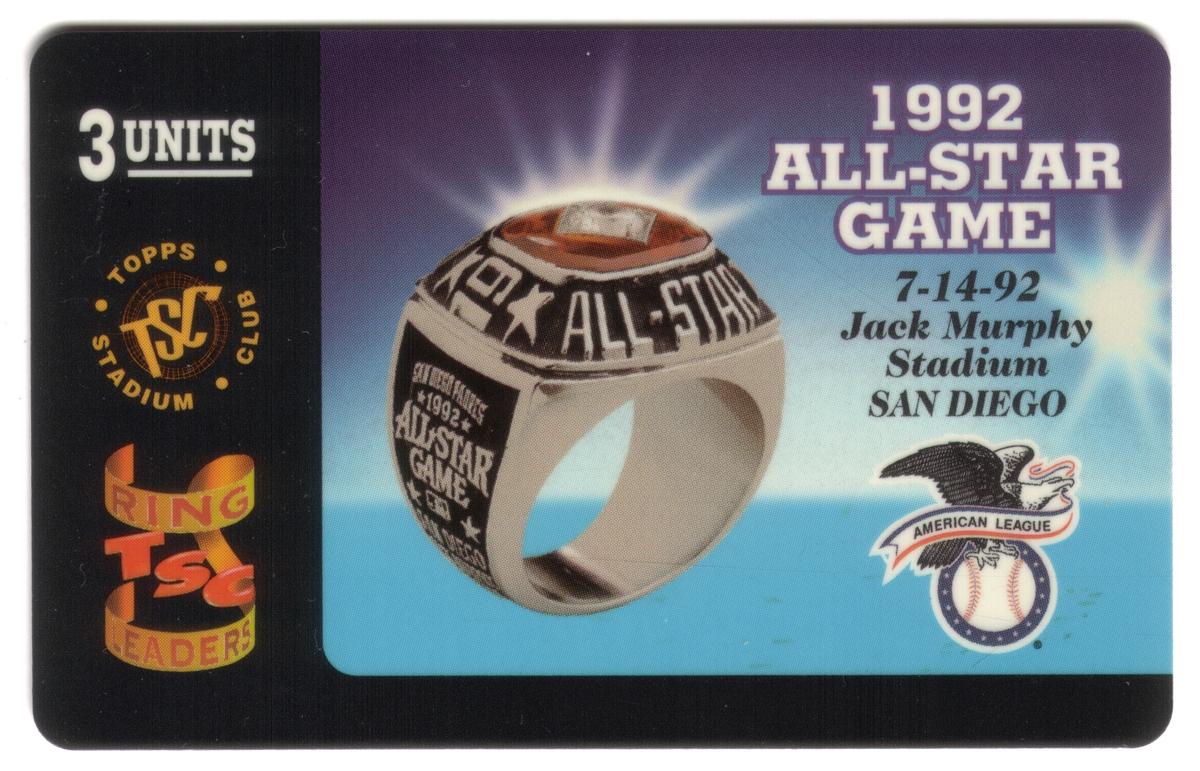 San Diego's Jack Murphy Stadium, the venue for the 1992 All-Star Game, is referenced clearly in the card’s text, grounding the collectible firmly in its specific location and time. The combination of sports logos, event titles, and corporate sponsorship make this card a factual record of the 1992 Major League Baseball All-Star celebration.