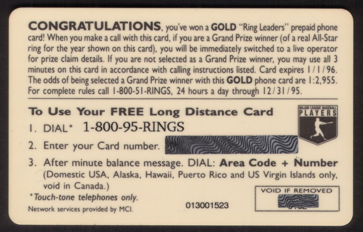 This collectible phone card features a detailed image of a gold ring commemorating the 1994 Major League Baseball All-Star Game. The ring has the words "ALL STAR" prominently displayed, along with intricate engravings on its sides. The card’s background transitions from a black left section to a gradient that moves from purple to light blue on the right, with the ring positioned at the center.