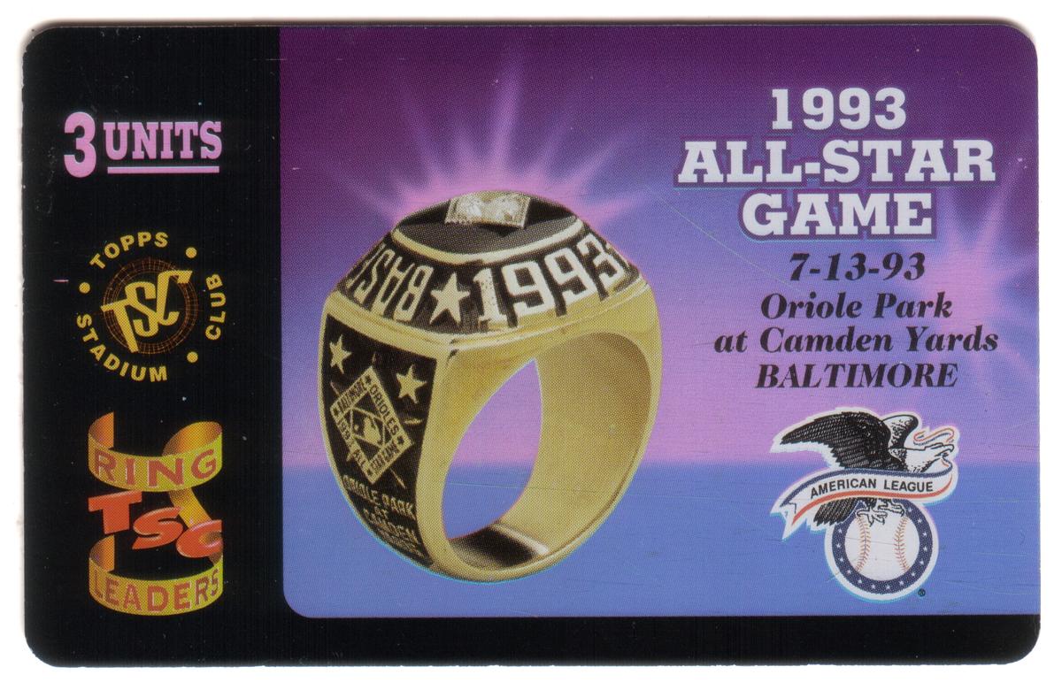 This card is a collectible phone card featuring the 1993 Major League Baseball All-Star Game held on July 13, 1993, at Oriole Park at Camden Yards in Baltimore, Maryland. The image prominently displays a detailed depiction of the 1993 All-Star Game ring, showcasing the year "1993" and the Topps Stadium Club logo on the front side in gold and black colors. The ring’s side panel includes a design referencing the American League of Professional Baseball Clubs.