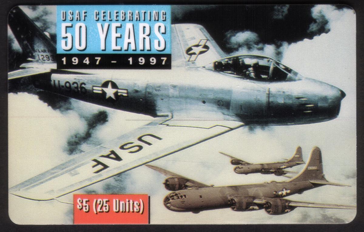 Centered on the card are modern fighter jets, which reflect the strength and technological advancement of military aviation. The card includes text noting the United States Air Force’s 50 years of service, with emphasis on the period from 1947 to 1997, marking a significant milestone in aviation history. The design links aeronautical achievements and aircraft such as bombers and fighters, celebrating their role in the Air Force across five decades.