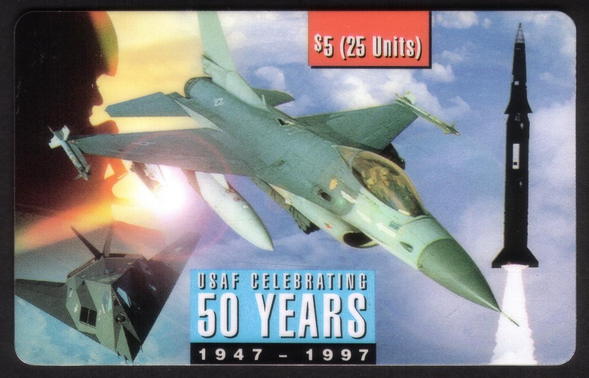 Produced by MCI Communications, this collectible $5 card reflects historical and technological milestones of the United States Air Force. The card’s visual elements and text collectively honor the service and evolution of the Air Force over its first 50 years, serving as a tribute to military aviation and the defense capabilities developed under the USAF banner.