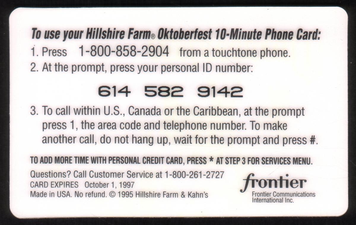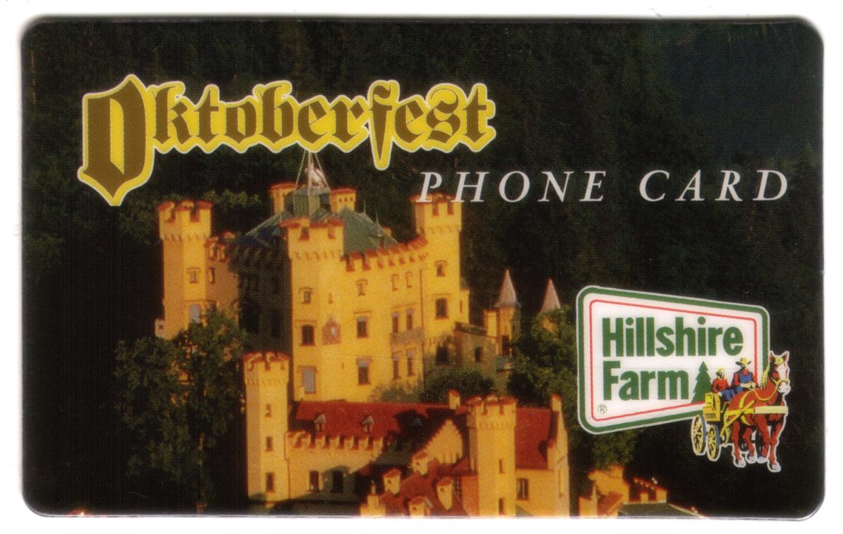 This phone card combines themes of Oktoberfest, the Hillshire Farm brand, and a castle image, making it a unique collectible item associated with the promotion of Hillshire Farm products and the Oktoberfest celebration.