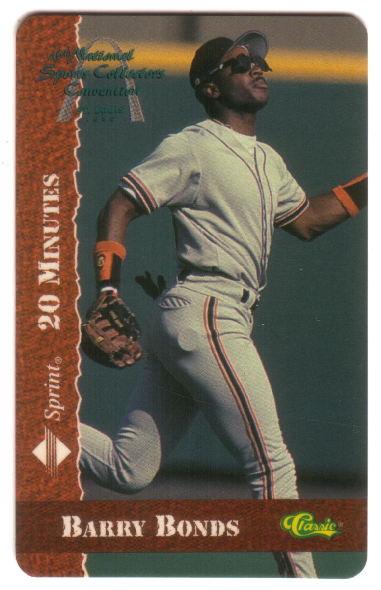 The baseball card shows Barry Bonds in mid-stride, dressed in a gray baseball uniform with black and orange trim. He wears black sunglasses and a black helmet with an orange bat logo on the front. Bonds is holding a baseball glove with an orange wristband on his left hand, looking upward.