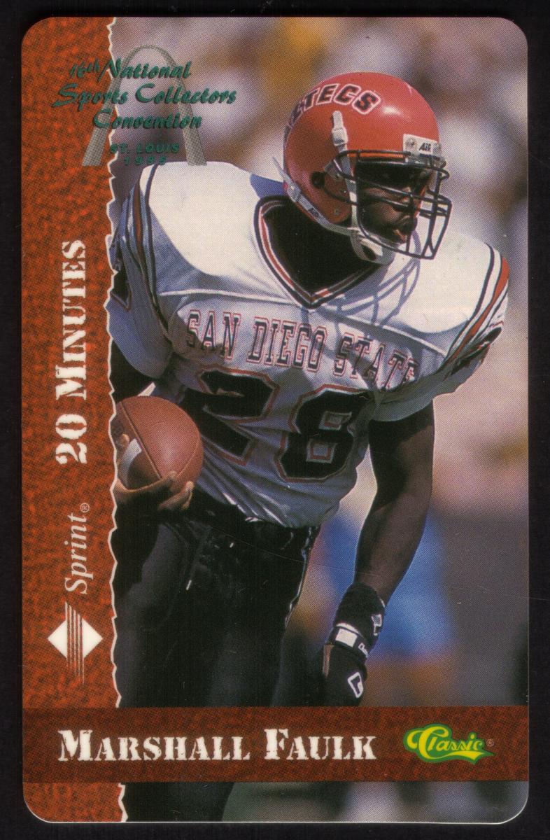 The football cards represent three different players: Ki-Jana Carter in a white uniform with navy blue numbers and black elbow pads; he is carrying a football while running. Marshall Faulk appears in a white San Diego State Aztecs uniform with the number 28, orange helmet with the Aztecs logo, and is holding a football, looking toward the field.