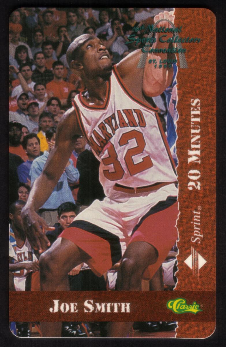 Two basketball cards portray Shaquille O’Neal in a white “Shaq” numbered 32 jersey, jumping toward the basket to block a shot against a defender wearing a dark blue jersey numbered 32. Joe Smith is depicted wearing a white and red Maryland jersey with the number 32, grasping the basketball during a contest near the basket, with other players and crowd in the background. Each card vividly captures the athletes in their sport during competitive moments.