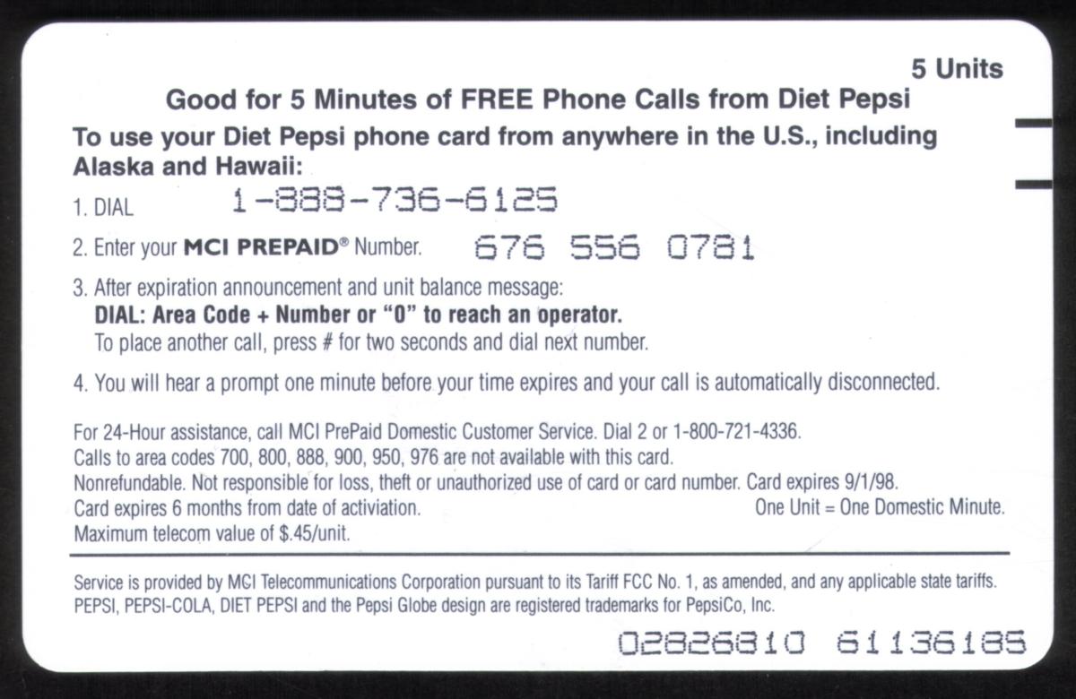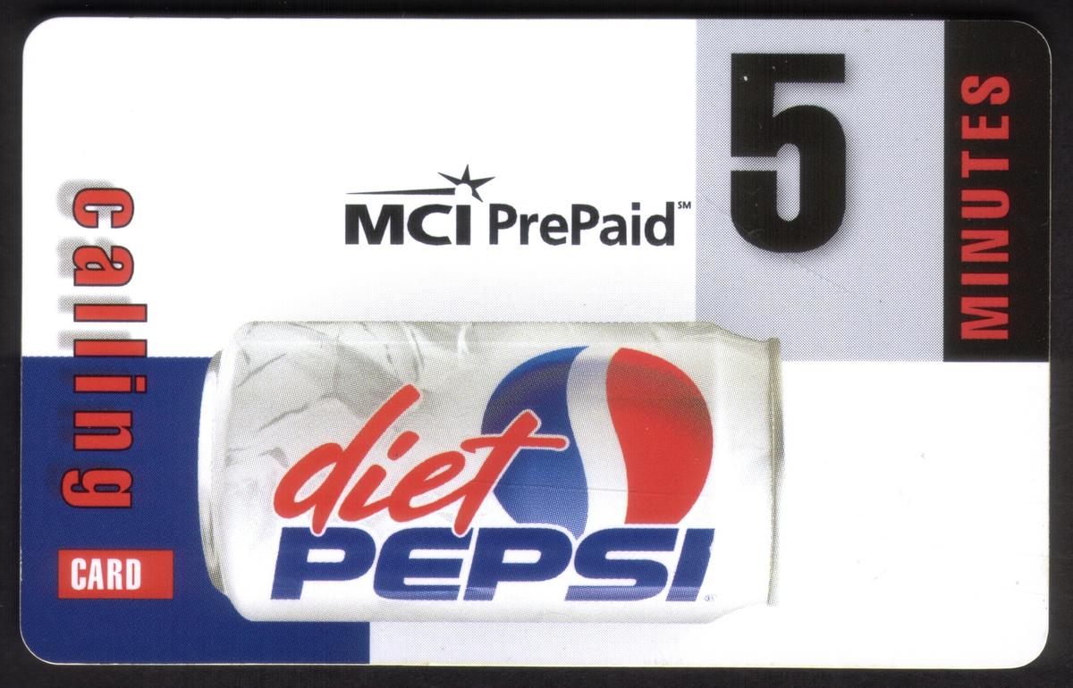 This collectible phone card features a promotional design for Diet Pepsi. The main graphic is a detailed image of a Diet Pepsi can lying on its side, prominently displaying the Diet Pepsi logo with the classic red, white, and blue color scheme. The can appears slightly crumpled, providing a realistic look.