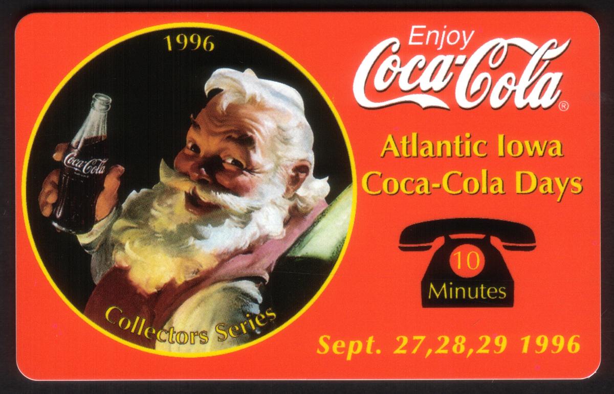 At the bottom right corner, there is text indicating "10m Atlantic Iowa Coca-Cola Days: 09/96," suggesting the card has a 10-minute usage limit and relates to a specific Coca-Cola promotional event or series in Atlantic, Iowa, dated September 1996. The Quest Group International is credited on the card, indicating the issuing or producing organization. The imagery integrates vintage-style Coke bottles and telephone-related graphics, consistent with collectible telephone cards from that era.