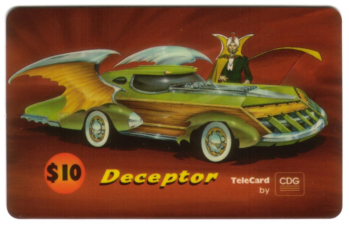 This collectible phone card features a fantasy-themed artistic design centered on transportation and automobiles. The artwork depicts a futuristic, imaginative automobile known as the "Deceptor Automobile With Wings." The vehicle is rendered with wings attached to its sides, blending elements of cars and aviation into a single concept. The design is highly stylized, with smooth, aerodynamic lines, and the automobile appears to be floating or flying amidst an abstract background.