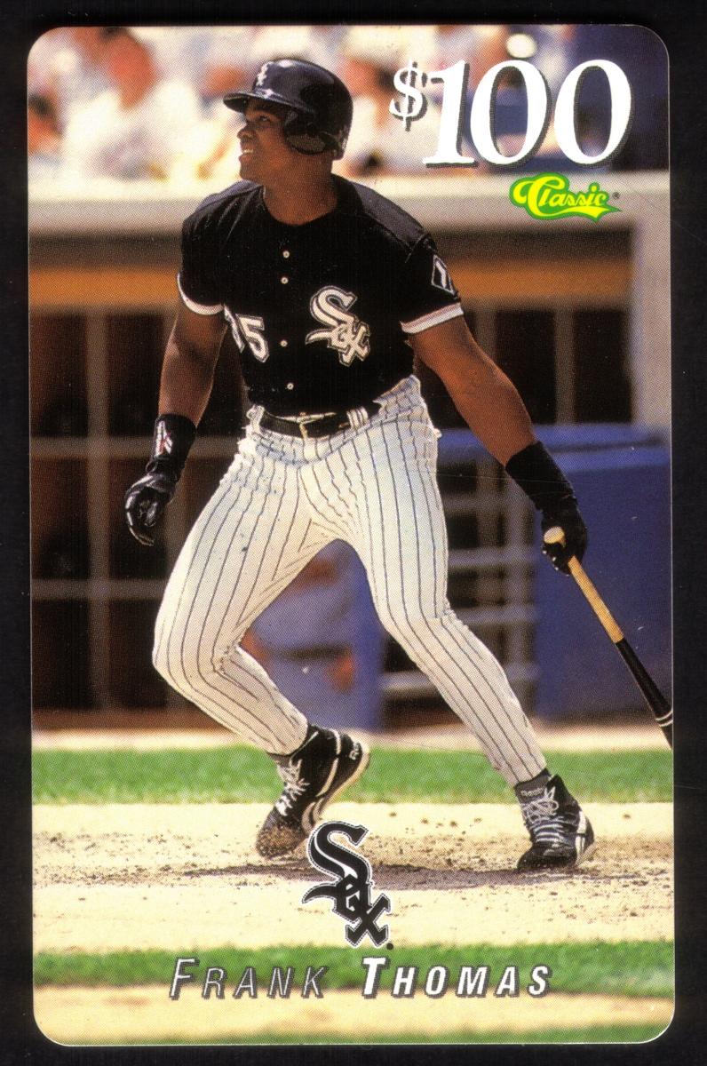 The card displays the Chicago White Sox team logo prominently near the bottom center, just above Frank Thomas's name, which is printed in uppercase letters with "FRANK" in black and "THOMAS" in white. The top right corner of the card indicates a value of $100, accompanied by the "Classic" brand logo in green and yellow. The overall design is vertical, emphasizing the full-body image of Frank Thomas in the baseball stadium setting.