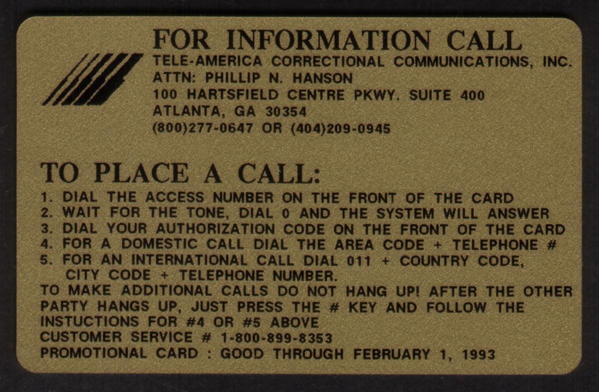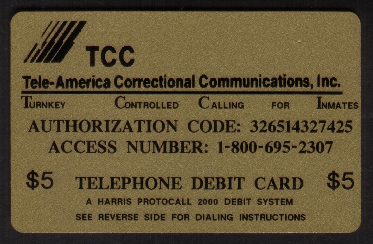This collectible telephone debit card is issued by Tele-America Correctional Communications, Inc. (TCC), a company specializing in controlled calling services for inmates. The card features a gold background with black text, prominently displaying the TCC logo at the top left corner. The full company name, "Tele-America Correctional Communications, Inc.," is printed beneath the logo along with the acronym explanation: "Turnkey Controlled Calling for Inmates."
