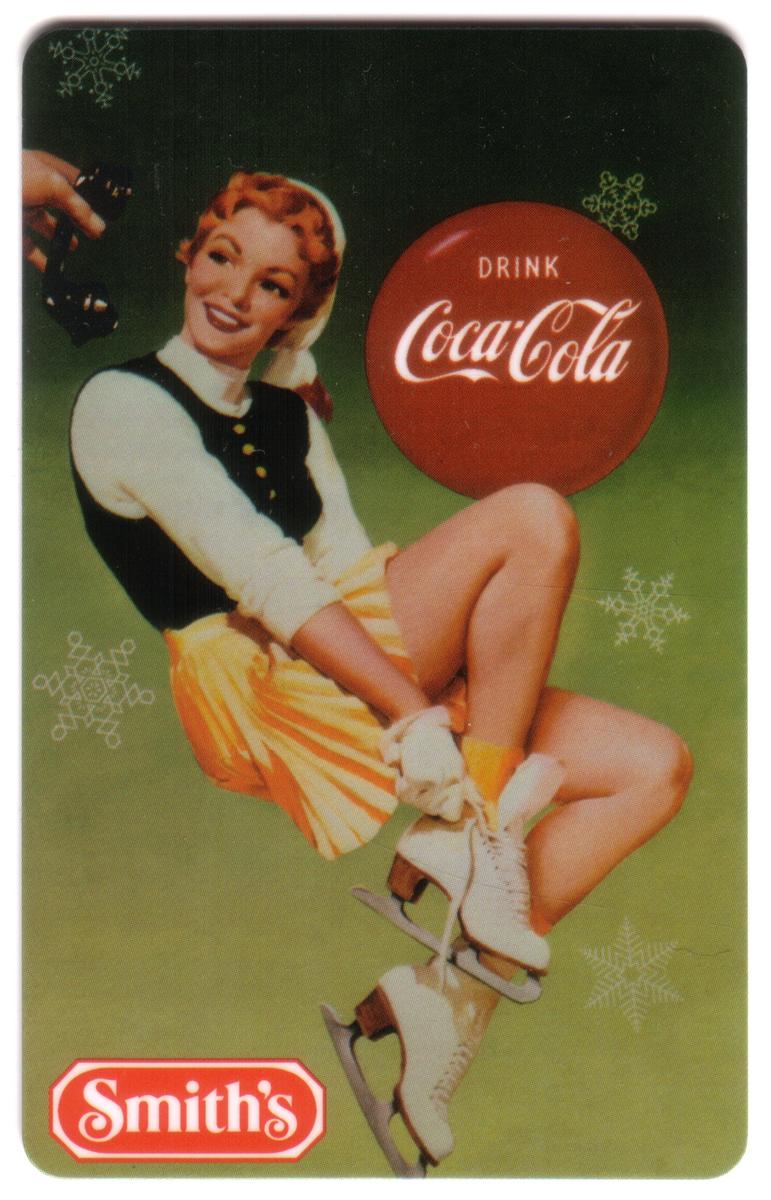 Prominently displayed in the upper right section of the card is a large red circle with the classic white script logo of Coca-Cola and the wording "DRINK Coca-Cola." In the lower left corner, the card shows the "Smith's" logo in white text on a red background, connecting to the Smith's brand. The overall design merges advertising for Coca-Cola with imagery of winter recreation, reflecting mid-20th century advertising aesthetics.