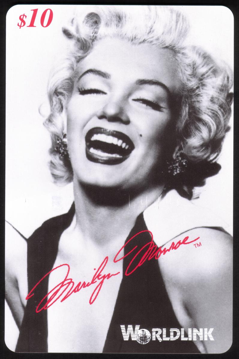 The card is issued by WorldLink Communications, prominently displayed along the card’s surface, indicating the company behind this collectible. The visual focuses on Marilyn Monroe’s face and upper body, emphasizing her classic beauty and joyful expression, which has made her an enduring symbol of Hollywood’s golden era.