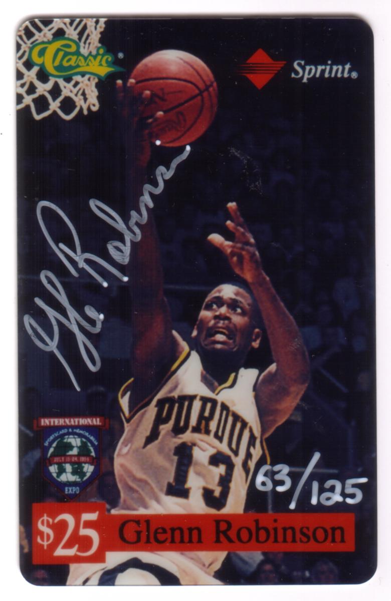 This collectible phone card features Glenn Robinson, wearing a Purdue University basketball uniform with the number 13, captured mid-action while attempting a layup towards a basketball hoop. The card prominently includes the autograph of Glenn Robinson in silver across the upper left side. The top left corner displays the Classic logo in yellow and green, while the Sprint logo in red is located in the top right corner.