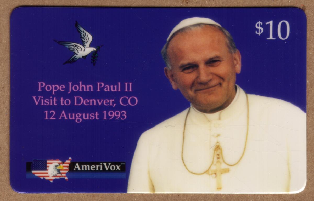 Commemorative $10 phone card featuring Pope John Paul II’s portrait, Denver visit date, peace dove, patriotic logo, blending utility with religious and historical significance. |